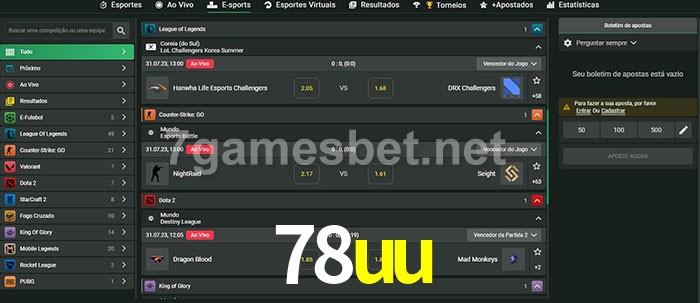 O 78uu oferece uma grande seleção de opções de apostas em e-sports com probabilidades competitivas